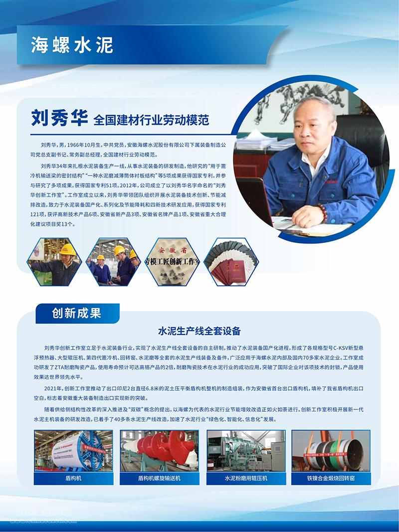 劉秀華始終扎根水泥裝備生產(chǎn)一線,從事水泥裝備的研發(fā)制造34年來,他研究的“用于篦冷機(jī)輸送梁的密封結(jié)構(gòu)”、“一種水泥磨減薄筒體襯板結(jié)構(gòu)”等5項(xiàng)成果獲得國(guó)家專利,并參與研究了多項(xiàng)成果,獲得國(guó)家專利51項(xiàng)。2012年,公司成立了以劉秀華名字命名的“劉秀華創(chuàng)新工作室”,2021年,工作室獲安徽省總工會(huì)授牌。自工作室成立以來,劉秀華帶領(lǐng)團(tuán)隊(duì)組織開展水泥裝備技術(shù)創(chuàng)新、節(jié)能減排改造,致力于水泥裝備國(guó)產(chǎn)化、系列化及節(jié)能降耗和四新技術(shù)研發(fā)應(yīng)用,獲得國(guó)家專利121項(xiàng),申報(bào)獲評(píng)高新技術(shù)產(chǎn)品6項(xiàng),獲評(píng)安徽省新產(chǎn)品3項(xiàng),獲評(píng)安徽省名牌產(chǎn)品1項(xiàng),獲安徽省重大合理化建議項(xiàng)目獎(jiǎng)13個(gè)。