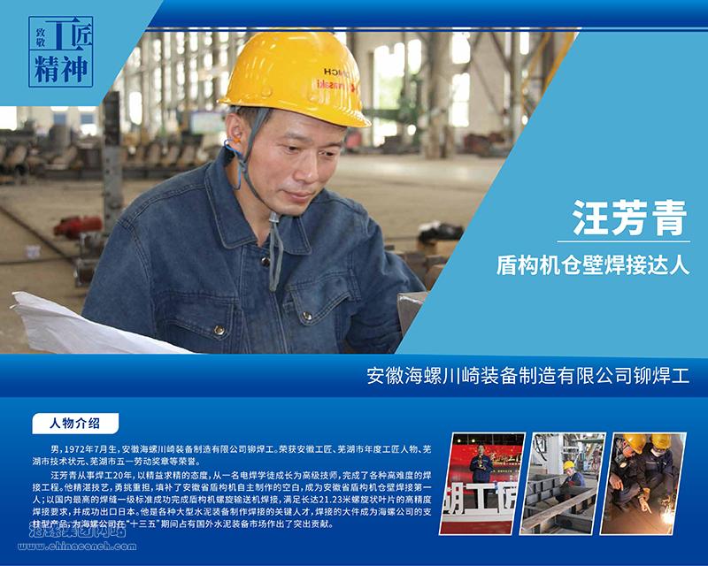汪芳青從事焊工20年,以精益求精的態(tài)度,從一名電焊學(xué)徒成長(zhǎng)為高級(jí)技師,完成了各種高難度的焊接工程。他精湛技藝,勇挑重?fù)?dān),成為安徽省盾構(gòu)機(jī)倉(cāng)壁焊接第一人,填補(bǔ)了安徽省自主制作盾構(gòu)機(jī)出口的空白;以國(guó)內(nèi)最高的焊縫一級(jí)標(biāo)準(zhǔn)成功完成盾構(gòu)機(jī)螺旋輸送機(jī)焊接,滿足長(zhǎng)達(dá)21.23米螺旋狀葉片的高精度焊接要求,并成功出口日本。他是各種大型水泥裝備制作焊接的關(guān)鍵人才,焊接的大件成為海螺公司的支柱型產(chǎn)品,為海螺公司在“十三五”期間占有國(guó)內(nèi)外水泥裝備市場(chǎng)作出了突出貢獻(xiàn)。